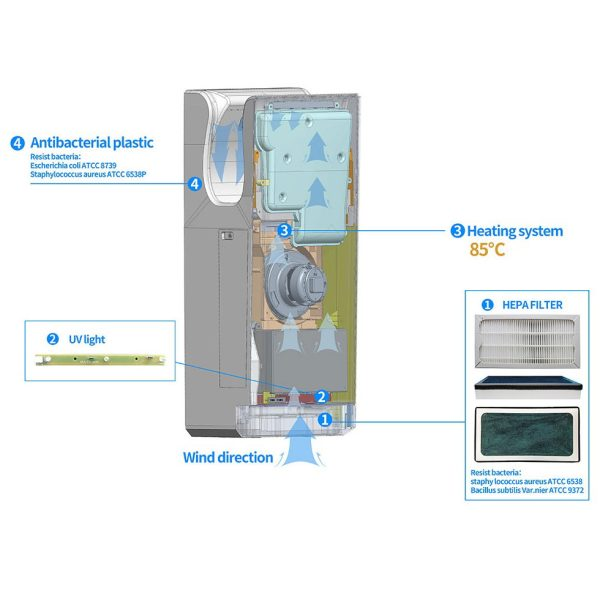 A: Yes. Its triple antibacterial/sterilization system (antibacterial material, UV light, 99.9% HEPA filtration) meets the strict hygiene standards of hospitals, clinics, restaurants, and cafeterias—making it the perfect hand drying solution for these sensitive environments.